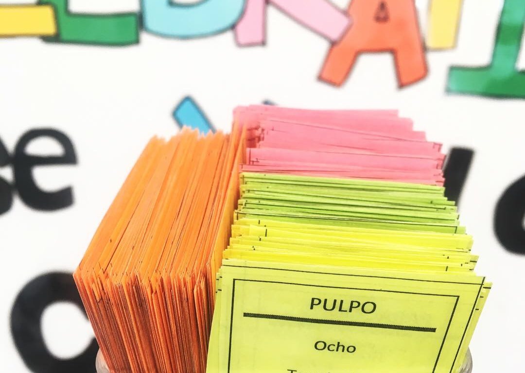En esta ocasión utilicé un tabú que encontré ya hecho en internet y lo imprimí en folios de colores (ya sabemos que la vida en color es más bonita, ¿verdad? 😋 ), lo plastifiqué, laminé y recorté. Una vez hecho todo eso, retiré aquellas tarjetas con palabras que no se adaptan al nivel de un niño de 6º de primaria. Este es el resultado.