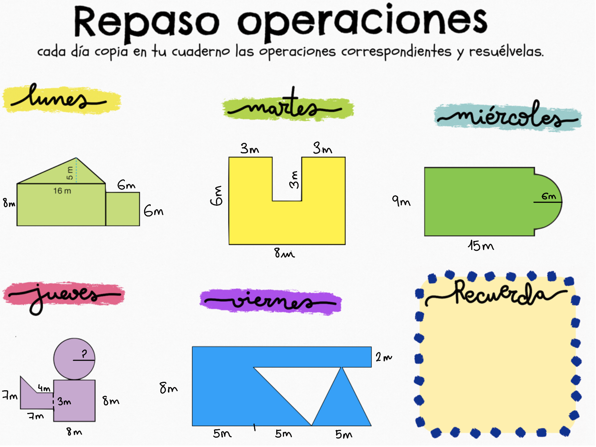 Esta semana, me vi en la tesitura de tener que retomar las operaciones combinadas y el cálculo de áreas en figuras combinadas tras comprobar al corregir el control, que muchos de ellos no habían estado al nivel que, normalmente demuestran. En estos casos, no hay que buscar culpable (¿falta de estudio? ¿falta de práctica? ¿culpa del profe?) sino solución y la mejor solución de todas es: