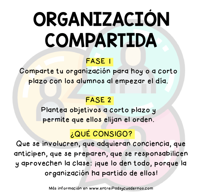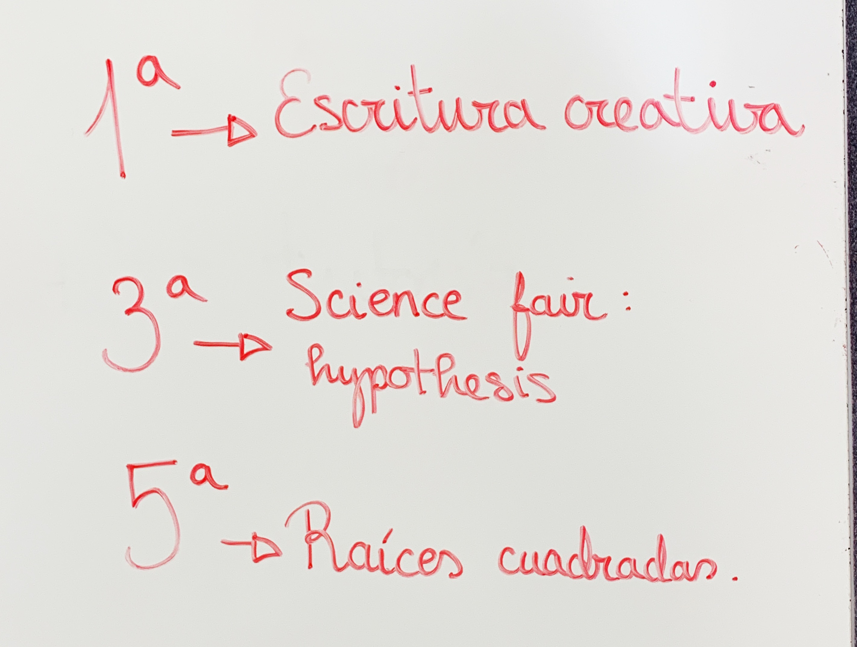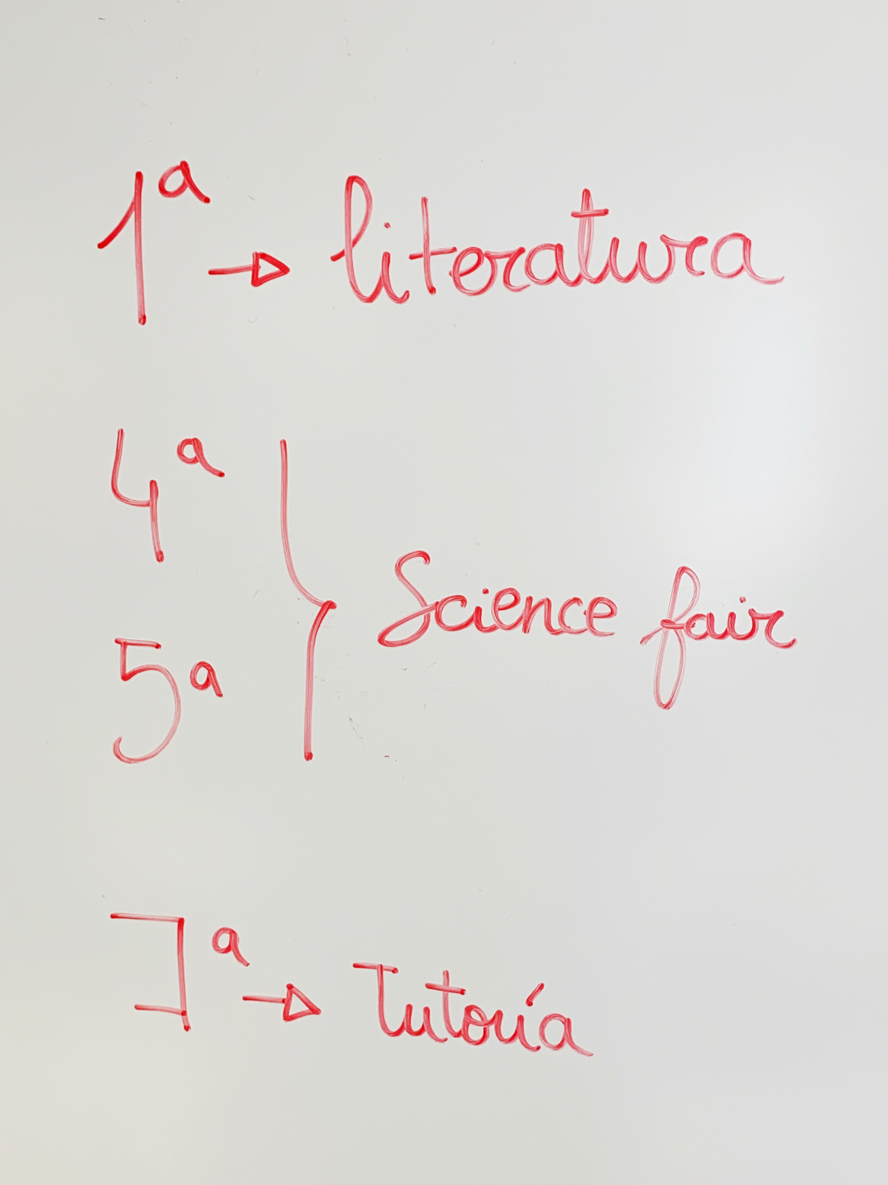 Por ello, desde el curso pasado, vengo aplicando lo que le llamo la organización compartida. Me gusta compartir la organización con mis alumnos porque así saben qué toca, qué vamos a hacer y qué espero de ellos: es decir, si durante los dos periodos del medio vamos a trabajar sobre la Science Fair, cuando lleguen del recreo ya sabrán qué tocara hacer y estarán mucho más centrados.