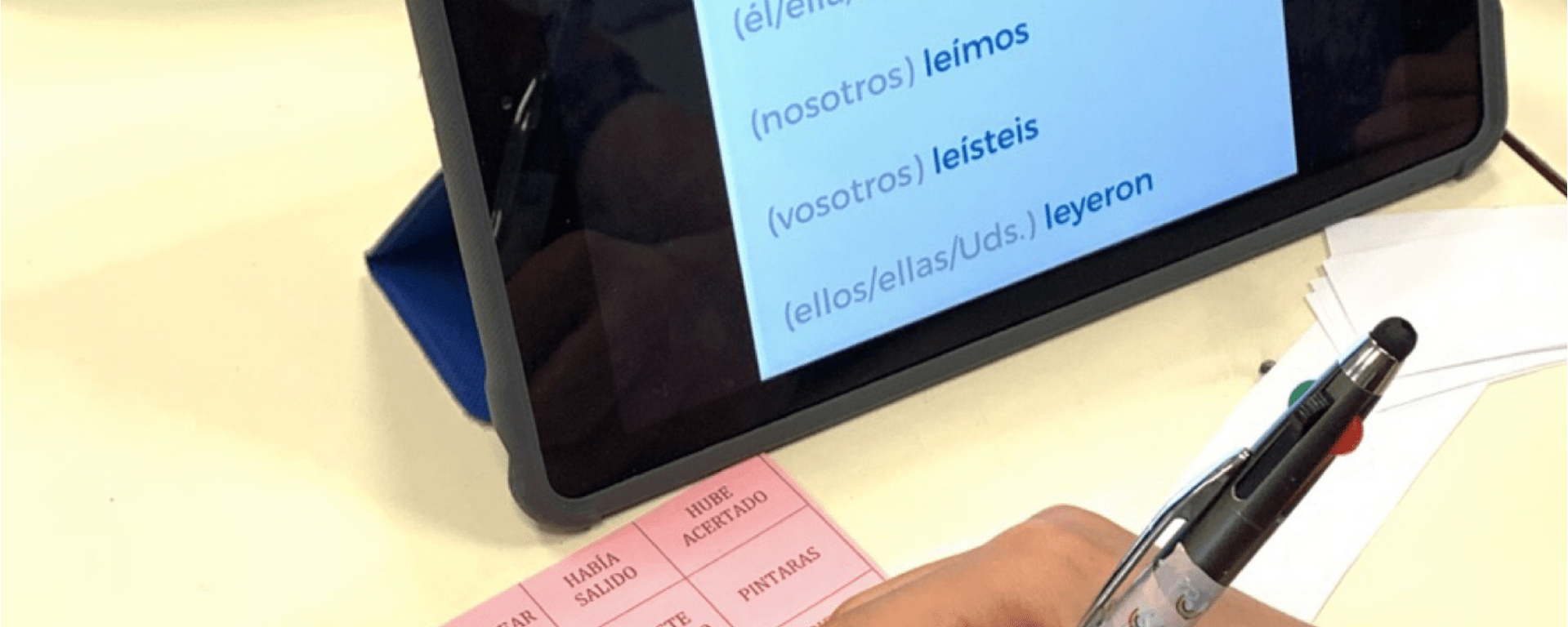 Después, metimos todas las tiras en una caja y empezamos a jugar: en este caso, la que cantaba las formas verbales era yo pero puede hacerlo cualquier alumno. Al describir la forma verbal, recomiendo que si son principiantes, antes de pasar a la siguiente, se diga en alto de qué se está hablando. Ejemplo, si el profe dice 2ª persona del singular del pretérito anterior del verbo cantar; pues entre todos se adivina que es hubiste cantado.