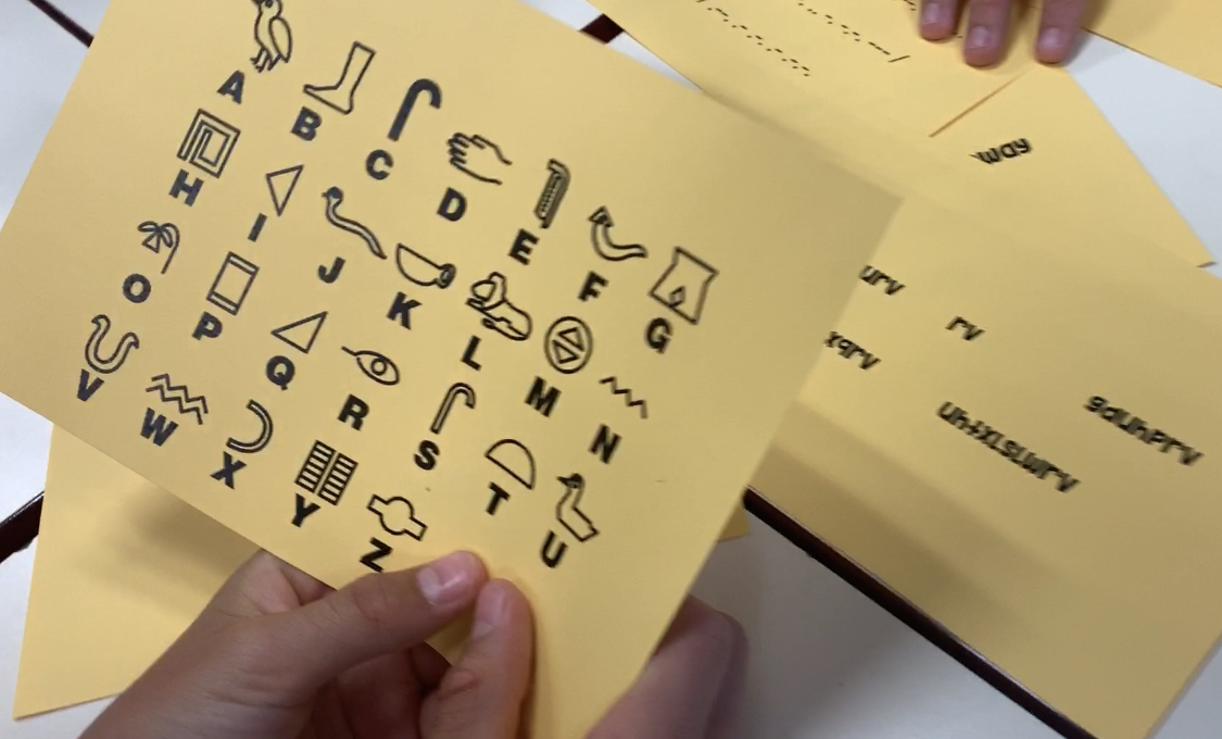 Después, les he puesto el caramelo diciendo que íbamos a hacer una competición clasificatoria para algo muy importante y que tenían que trabajar en equipo para intentar ser los primeros. A continuación, les he dado un mensaje partido en varios trozos de cartulina con el texto cifrado: francmasón, julio césar, morse, pig latin… así como la clave que les ayuda a resolverlo.