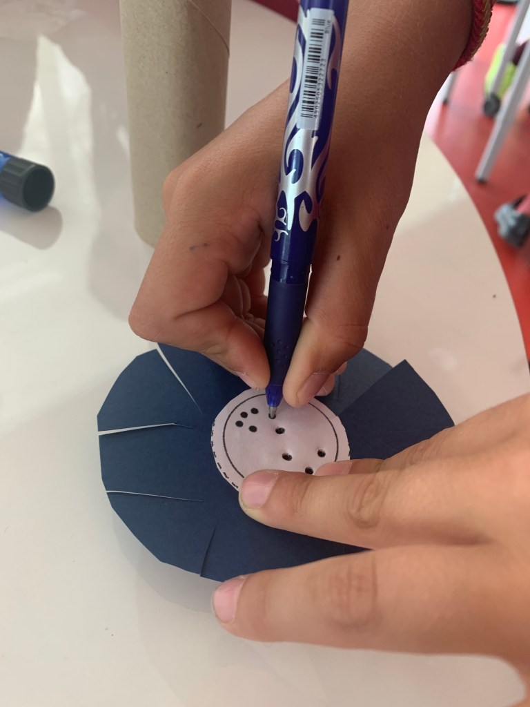 Una vez que la han construido, han tenido que poner el nombre de la constelación y algo de información sobre el tubito con rotuladores, adornándolo.