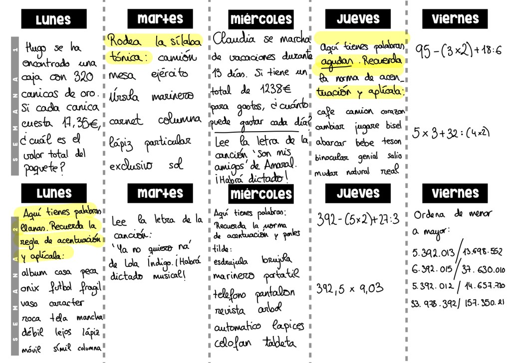 Decidí incorporar esta rutina a la rutina ya establecida RUTINA MENSUAL, donde se les da a los alumnos, a principio de mes, los diferentes ejercicios o tareas de repaso para cada día. Os pongo un ejemplo de cómo queda la rutina semanal.