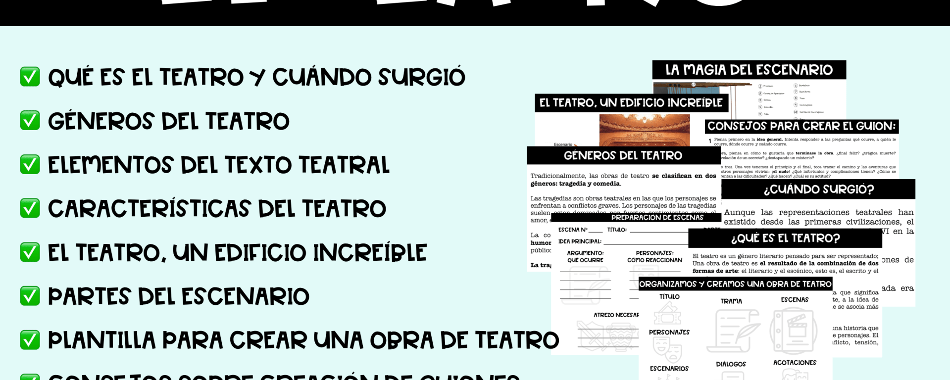 ¡Hola a todos! Hoy os traigo un material algo distinto a los demás porque no consiste tanto en tarjetas de expresión oral o juegos de escritura creativa sino más bien una unidad didáctica entera del teatro así como plantillas donde a nuestros alumnos les resulte más sencillo crear una obra de teatro con sus diferentes escenas.