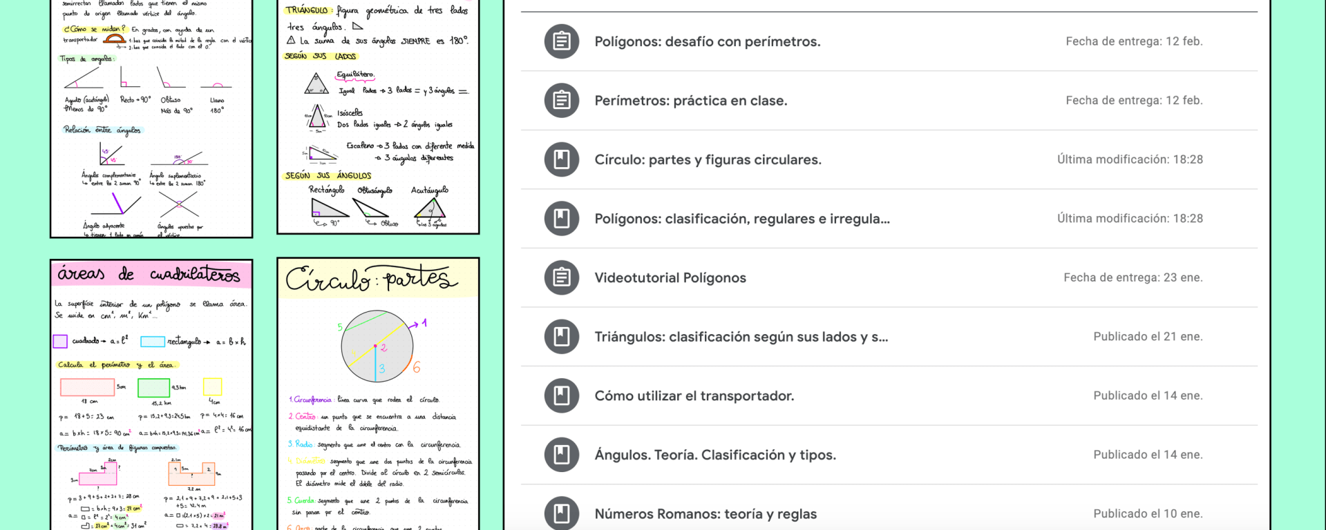 La otra aplicación que utilizo es Google Classroom. Es mi día a día. Me permite entre muchas cosas, organizar todos los apuntes que vamos generando para que mis alumnos lo tengan a mano. Con 10 años es normal que muchos hagan los apuntes y les queden sucios, desordenados e ilegibles… pues bien, las familias y ellos mismos saben que en Classroom lo encontrarán.