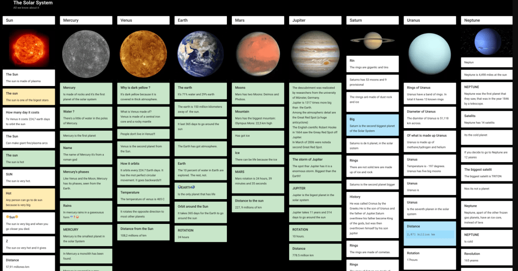 ¿Cómo lo uso? Una de las maneras que ME ENCANTA utilizar Padlet es para hacer la dinámica de KWL: que sé (Know), que quiero saber (Want to know) y que he aprendido (Learnt)… cada letra una columna. Otra manera en el que lo empleo es, por ejemplo, para saber cuánto saben sobre los planetas del Sistema Solar, creo un Padlet con cada planeta en una columna y les dejo pensar y escribir durante 15 minutos. Después vemos qué han escrito y lo vamos corrigiendo: verde si está correcto, amarillo si está incompleto o rojo si está incorrecto. Después de haber hecho la lluvia de ideas, utilizan el Padlet para ir completándolo con cosas que vayan aprendiendo y así, creamos un muro de curiosidades sobre el tema que estemos trabajando. Creo que es una herramienta que debería utilizarse únicamente dos o tres veces en el curso porque si no, como todo, resultaría pesado y perdería la fuerza que esta App tiene.