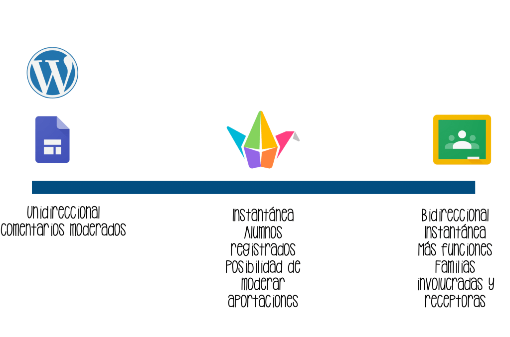 Espero que os haya gustado la publicación de hoy y os animéis dar un pequeño paso. Si tuvierais que empezar con alguna, a continuación os dejo una imagen que espero ayude a clasificar su uso… ¡y su riesgo! Hablo de la palabra riesgo con connotaciones positivas porque un blog de aula, si tu quieres puedes quitar los comentarios y que sea simplemente un cajón recibidor donde los alumnos acudan a por vídeos o materiales… o puedes utilizar comentarios y enriquecer la direccionalidad del contenido. Con Google Classroom, entra en juego el hecho de que los alumnos pueden comentar y todo lo que publiques les llega a las familias. Para mí es algo muy positivo pero si prefieres empezar más suave (¡que lo entiendo), te sugiero echar un vistazo a esta imagen:
