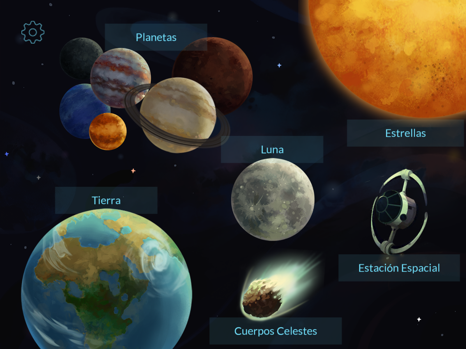 - Tiene ‘cuarto de ejercicios‘ donde, por ejemplo, en el del Sistema Solar, tienes tu propia nave que está vacía y vas consiguiendo objetos decorativos y funcionales conforme vas completando los diferentes ejercicios de práctica.