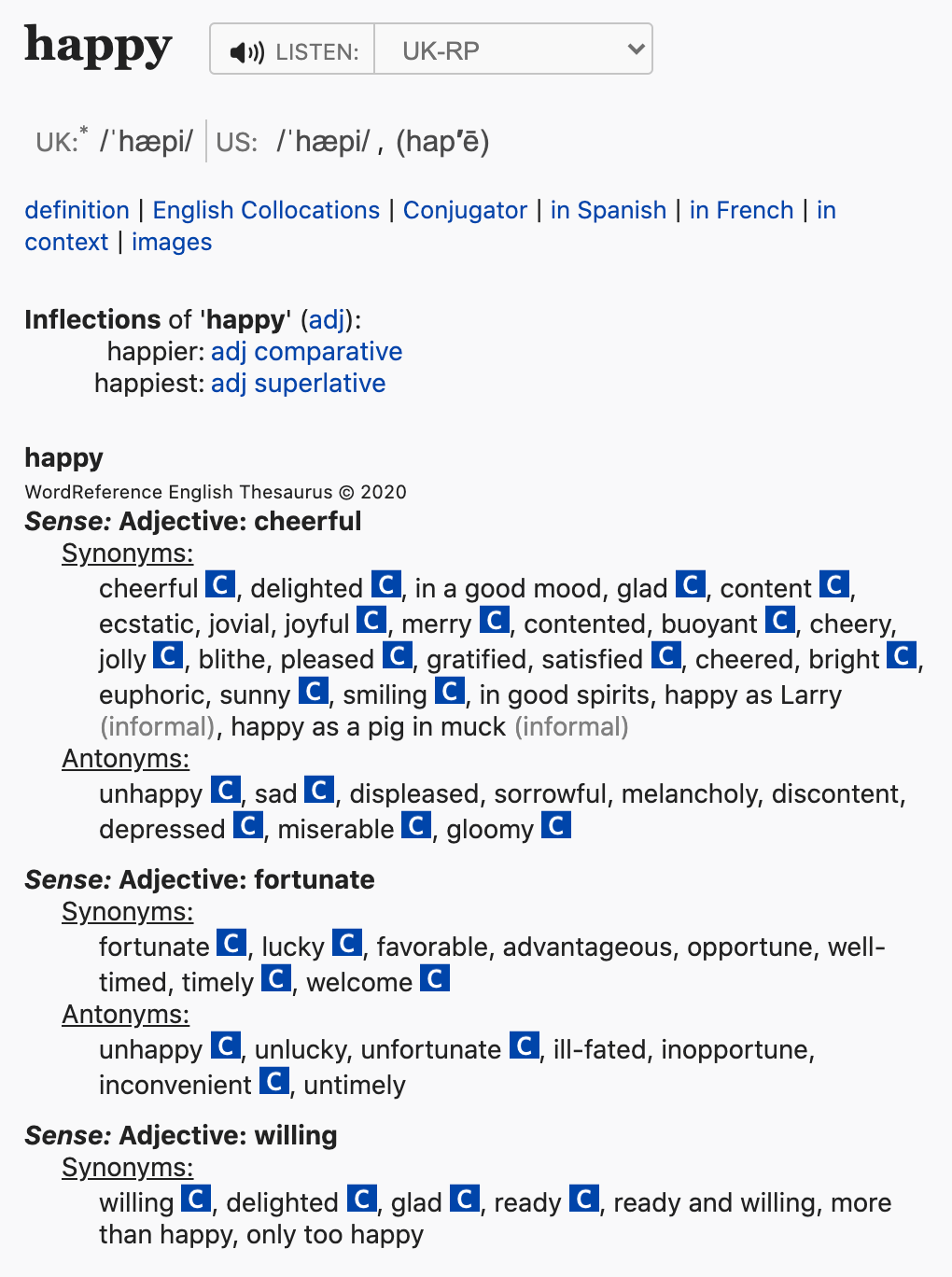 Una opción que me parece realmente atractiva es la de sinónimos, tanto en inglés como en castellano. Nos permite buscar y encontrar palabras que tienen matices diferentes. Encuentro esto muy útil cuando creo materiales, sobre todo sobre inteligencia emocional. ¡Me ayudan a dar con la palabra correcta! En las asignaturas que enseño en inglés, me ayudan a elevar un poco el nivel con mis alumnos, de tal manera que una vez sé que controlan el término simple, ejemplo happy, puedo introducirles otros sinónimos con otros matices como delighted, cheerful, merry… o antónimos.