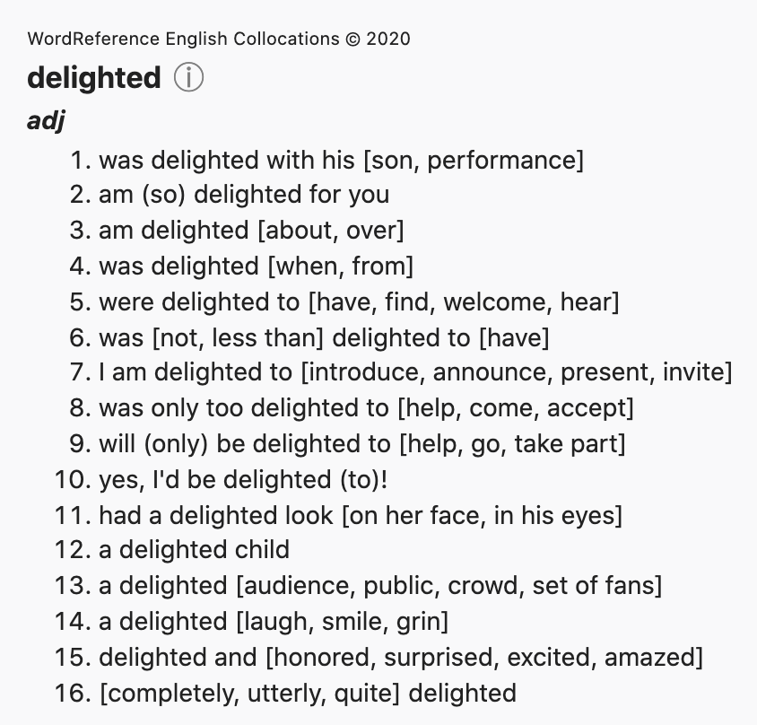 En la primera imagen, uso de sinónimos. Te sirve a ti para aprender y para controlar qué términos utilizamos con nuestros alumnos. En la segunda, a partir de la primera ¿veis donde pone delighted que hay una lunita (o una C con fondo azul)? Son collocations: si le das ahí, accedes a la segunda imagen y ¡guau!