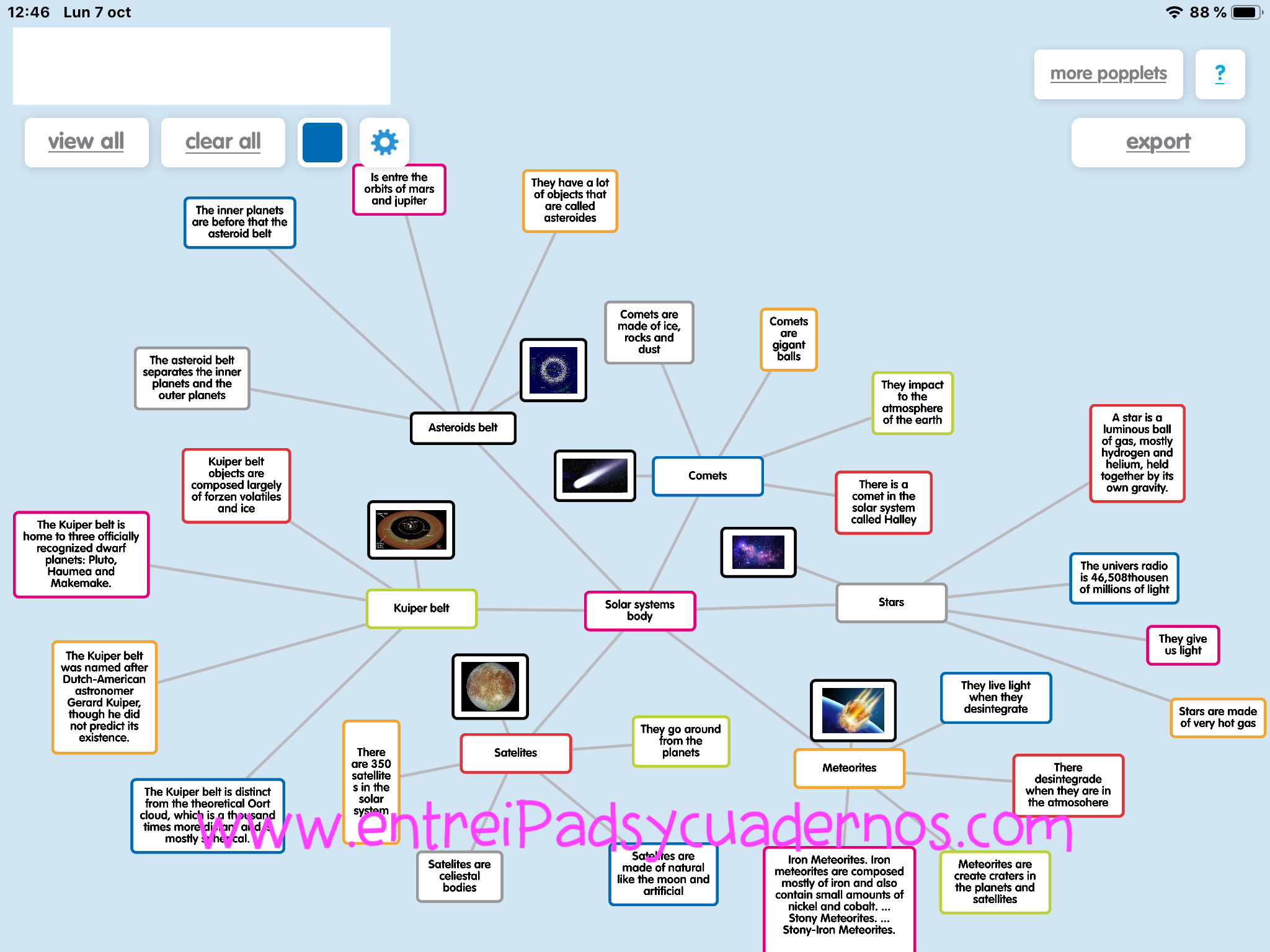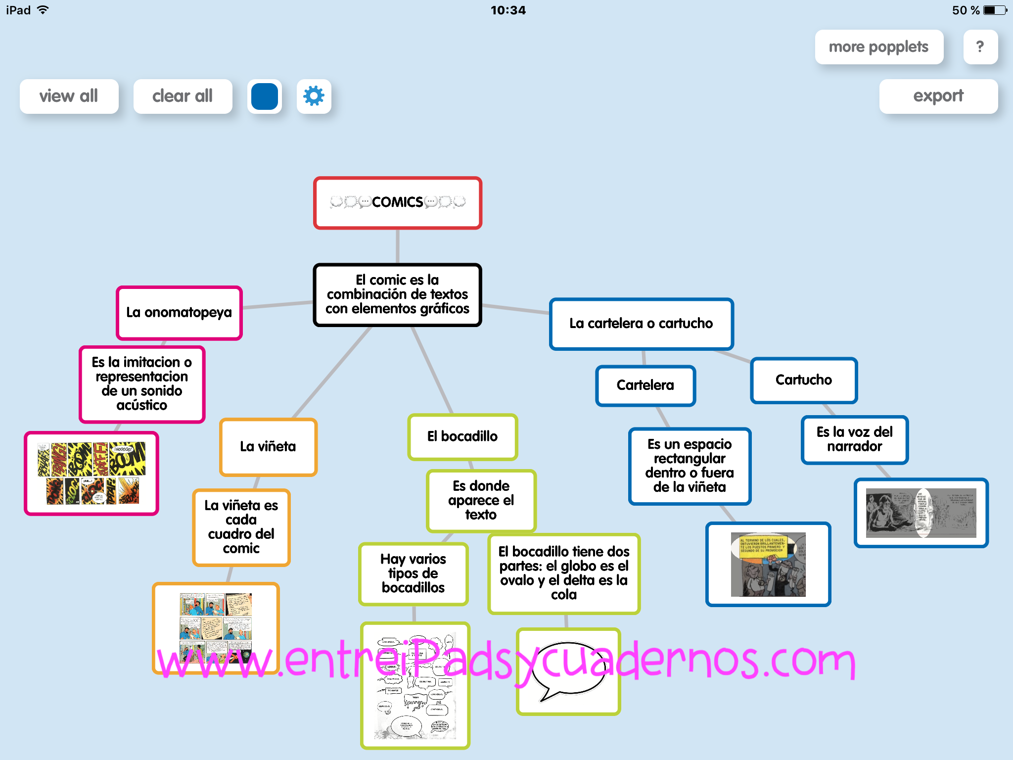 Popplet es una app que ayuda a nuestros alumnos a realizar mapas mentales. Es especialmente útil para cursos como 3º y 4º de primaria donde ya empiezan a asociar conceptos peeeeero no son lo suficientemente maduros como para realizar esquemas. Además es una aplicación que te permite introducir imágenes, de tal manera que, como docente puedes utilizar Popplet para crear mapas mentales vacíos, imprimirlos y dárselos a tus alumnos.