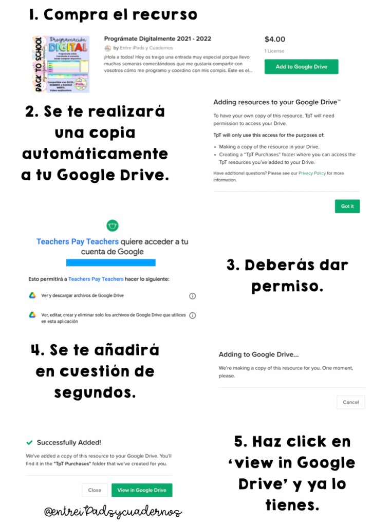 Una vez adquieras el recurso, deberás seguir los pasos que te va marcando Teachers Pay Teachers para hacer llegar el documento a tu unidad de Google Drive. Te los dejo resumidos aquí: