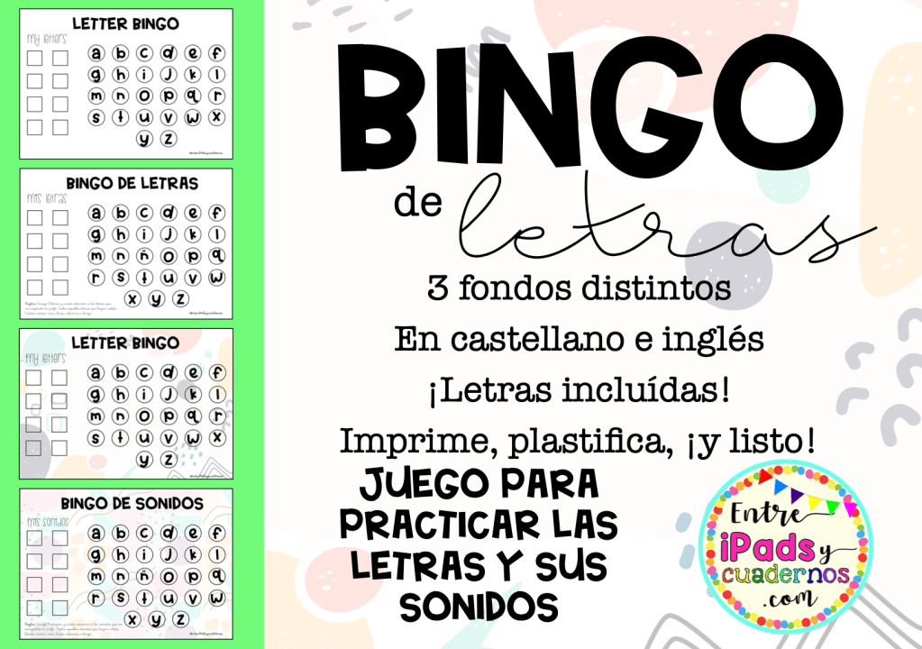 Aquí el Bingo de letras, en 🇪🇸 y 🇬🇧, perfecto para el primer curso de primaria. Es una forma de repasar (o incluso aprender) las letras, trabajar la atención, la paciencia de forma divertida y conocida: ¿quién no ha jugado al bingo alguna vez con su familia?