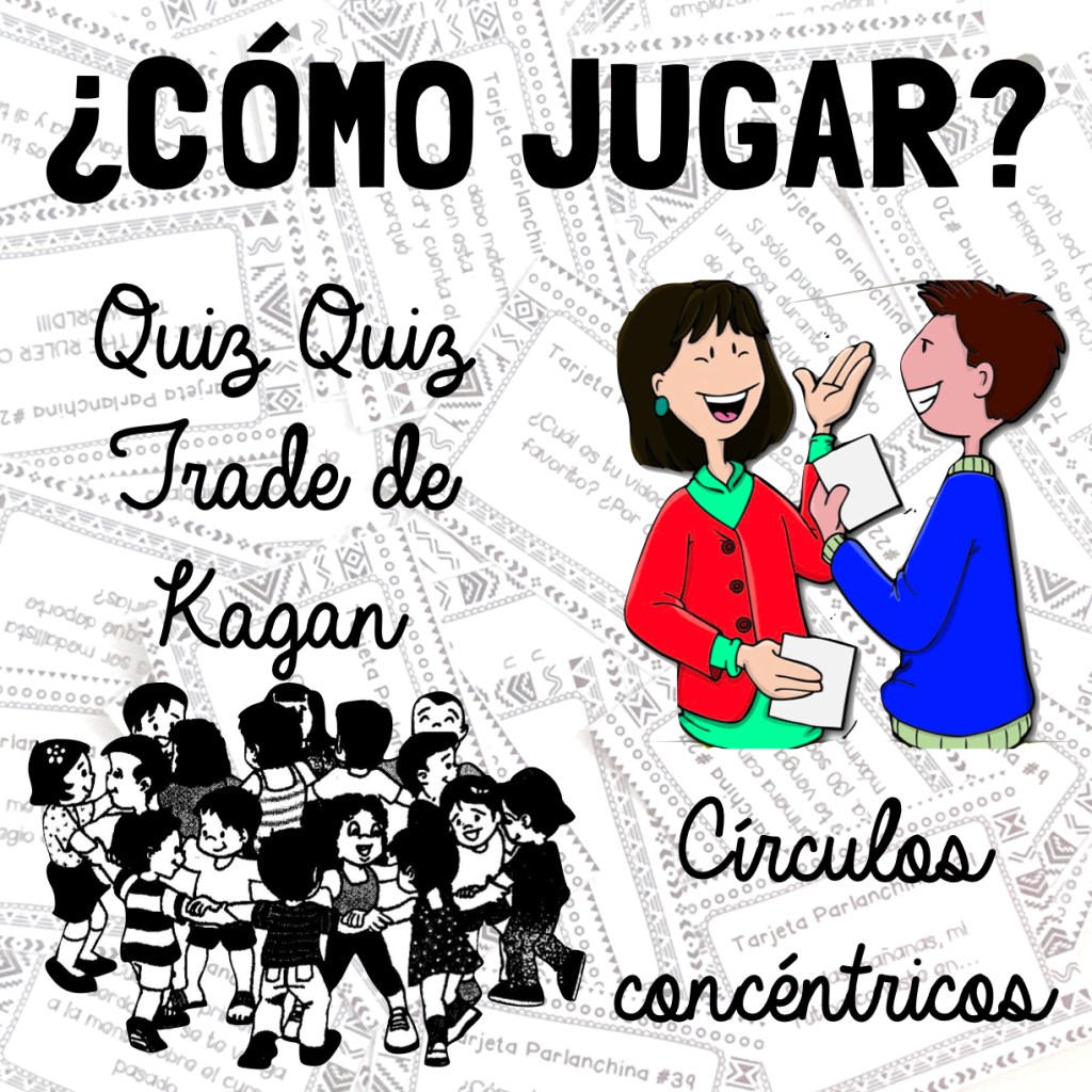 Otra manera de utilizarlas es mediante la estructura de Kagan conocida como Quiz Quiz Trade donde cada alumno coge una tarjeta y se va paseando por la clase con la mano levantada. Cuando ve a otro compañero con la mano levantada, la chocan y se hacen la pregunta. Primero uno y después otro según lo acordado, por ejemplo… el que sea más joven empieza y ya después de hacerse las preguntas han de intercambiarse las tarjetas, levantar la mano y seguir paseando por la clase.