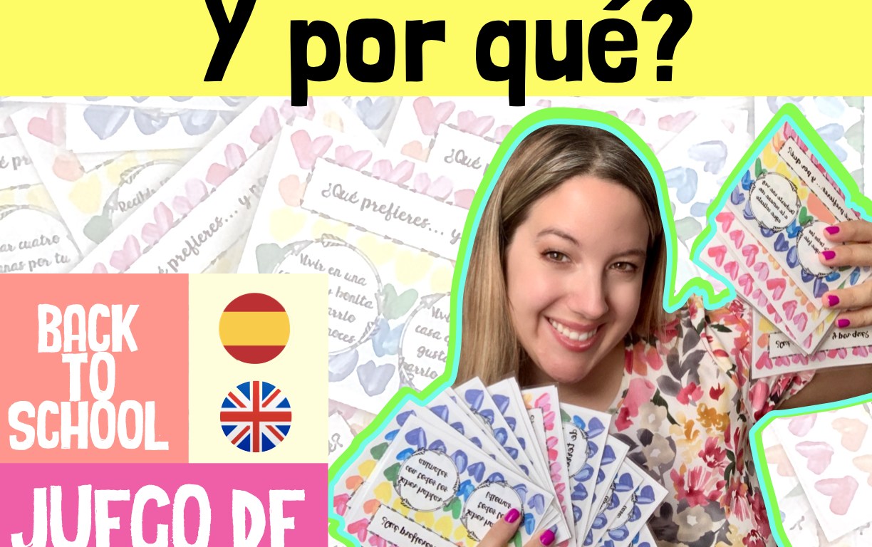 Como conté en su día, es la típica actividad de qué prefieres: esto o esto, pero en bonito. Las puedes imprimir y laminar o simplemente proyectar y hacer que se muevan a un lado u otro de la clase, dependiendo de la preferencia de cada alumno. Con esta actividad los alumnos pueden conocerse más ya que cada tarjeta les pone en situación y han de elegir. Algunas tarjetas son sencillas, del estilo: pizza o pasta mientras que otras exigen algo más de reflexión. Además, la segunda parte se llama: ¿por qué? es decir, que el compañero o yo misma podemos pedirles que argumenten su decisión. ¡Maravilloso para empezar el debate!